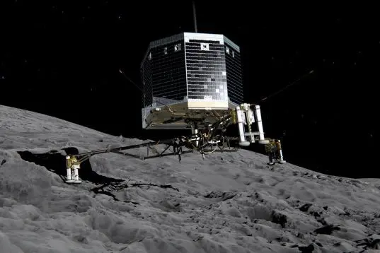 Dopo settimane di analisi per scegliere il luogo ideale per la discesa, Rosetta ha rilasciato un piccolo lander: un cubo di un metro di lato dotato di tre “zampe” e con 27 chilogrammi di apparecchiature scientifiche. Philae, questo il suo nome, si è posato sulla superficie della cometa, alla quale si è attaccato con degli arpioni. La forza di gravità, infatti, è piccolissima e senza questo espediente il robot non potrebbe restare attaccato al corpo celeste. Aggrappato al suolo come un alpinista in parete, dunque, Philae analizzerà direttamente la superficie e – grazie a una piccola trivella – il nucleo della cometa. È qualcosa che nessuno mai aveva fatto prima ed è un successo tutto europeo.