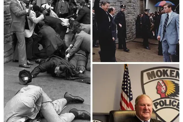 Parla senza enfasi Timothy (Tim) McCarthy, l’agente della scorta di Ronald Reagan che nel primo pomeriggio del 30 marzo del 1981 rimase ferito da una delle pallottole sparate da John Hinckley contro il quarantesimo presidente degli Stati Uniti. Due foto ritraggono McCarthy in quel giorno che tenne l’America e il mondo con il fiato sospeso. Una lo mostra in piedi, guardingo, di fronte a Reagan che alza il braccio destro per salutare. Nella seconda foto McCarthy è riverso a terra, con la mano destra chiusa a pugno e la mano sinistra che preme il corpo nel punto della ferita. Alle sue spalle si vede un parapiglia: un poliziotto a terra, il corpo del’addetto stampa Jim Brady e gli uomini della sicurezza con le pistole in mano che si avventano contro l’attentatore.