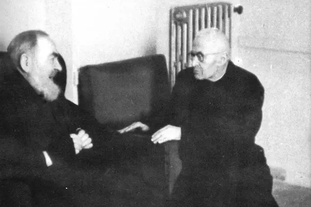 «Stamattina è stato in visita dal P. Pio il Rev.mo Don Giacomo Alberione, Primo Maestro e Fondatore della Pia Società S. Paolo. È stato a pranzo con la comunità e si è trattenuto in fraterno colloquio col P. Pio nel salotto sopra la scalinata». Queste quattro righe, vergate in una grafia ordinata e piuttosto minuta, in data 3 maggio 1965 sulla Cronistoria del Convento di Santa Maria delle Grazie dei Frati minori cappuccini di San Giovanni Rotondo sono la prima traccia documentale dell’unico incontro avvenuto tra il Santo delle stigmate e il Beato, apostolo della Parola nella contemporaneità. Un’altra è costituita dalla firma lasciata da Alberione sul registro dei visitatori quello stesso giorno, la terza è la foto che ritrae i due insieme, sorridenti, durante il colloquio. Ma quali furono le ragioni di quel rendez-vous e che cosa effettivamente si dissero? Chi scrive ebbe l’opportunità, quattro anni fa, in occasione del centenario della stigmatizzazione e del cinquantesimo anniversario della morte di san Pio da Pietrelcina, di conoscere l’ultimo testimone superstite dell’incontro, fra Luigi da Serracapriola, al secolo Teodorico Beniamino Ciannilli, scomparso lo scorso anno novantaseienne, raccogliendone i ricordi vivi e avvincenti. «All’epoca», raccontò, «ero padre guardiano al Convento dell’Immacolata di Foggia e la nostra Provincia non viveva un momento felice. Si pensava che volessero sopprimerla. Padre Pio soffriva molto per quest’eventualità». Forse, quindi, ipotizzava il religioso, potrebbe averne voluto parlare ad Alberione, molto vicino a Paolo VI. Anche don Giacomo, tuttavia, aveva qualcosa su cui confrontarsi con il futuro santo: «Aveva in mente di costruire tre ospedali, uno per le religiose e l’altro per i religiosi della Famiglia che aveva fondato e un terzo per tutto il clero. Questo me lo confidò padre Angelico d’Alessandria, che era stato visitatore presso i Paolini e da allora aveva un dialogo privilegiato con il beato Alberione. Forse voleva sapere bene quali scogli avesse affrontato la Casa Sollievo della sofferenza. Poi però il beato riuscì a costruire solo la clinica Regina Apostolorum ad Albano Laziale, dove fra l’altro poi io sarei stato curato per un problema alla prostata. Fu padre Angelico, che stava nel mio convento, a coinvolgermi in quello storico incontro». Don Giacomo partì da Roma verso le sei del mattino sull’auto guidata da fratel Silvano De Blasio e arrivò a Foggia dopo circa quattro ore. Nell’informare l’autista del loro viaggio per l’indomani, non aveva accennato né a San Giovanni Rotondo né a Padre Pio, ma solo a Foggia come meta finale e a padre Angelico di Alessandria come persona da incontrare. In più, secondo quanto riferito dallo stesso De Blasio, gli raccomandò di mantenere il massimo riserbo su quella “missione”. Giunti al convento foggiano dell’Immacolata, padre Alessio e padre Ciannilli salirono sulla loro auto. Ricordava il secondo: «Alberione per tutto il tragitto sino a San Giovanni Rotondo non disse neppure una parola. E non c’è da stupirsi, i santi parlano poco, e s’intendono alla perfezione fra loro. Noi, anche con un certo imbarazzo, pregammo in silenzio, ognuno per conto suo. Arrivati nel convento di Padre Pio, chiedemmo di lui e accompagnammo l’illustre ospite nella sala vicina al refettorio dove era atteso». Prima del rendez-vous era stato preparato un pranzo nel refettorio, ma Alberione non toccò quasi cibo, segno che aveva fretta di parlare con san Pio. «Alberione, con atto d’umiltà, fece per baciare la mano coperta dal guanto del cappuccino stigmatizzato, ma lui la ritrasse, allora l’ospite gli si sedette accanto», spiegava ancora padre Luigi. «Era evidente il rispetto che avevano l’uno per l’altro. Non so quanto esattamente parlarono: noi ci allontanammo. Discussero almeno per una ventina di minuti. Poi Alberione e l’autista che l’aveva accompagnato andarono via, direttamente a Roma, padre Angelico e io rientrammo per i fatti nostri». Qualche tempo dopo, Valentino Gambi, allora direttore delle Edizioni Paoline, andò a sua volta da san Pio e si sentì dire a proposito di don Alberione: «Non dimenticarti, figliolo, che stai alla scuola di un santo». E rivolto al confratello che lo accompagnava, spesso autista del futuro beato, aggiunse: «Non ammazzarmelo quel santone! Quante cose egli vuole ancora fare per Gesù e per le anime servendosi dei mezzi più efficaci per portare il Vangelo in ogni angolo del mondo. Seguitelo in tutto, senza stancarvi mai! Te ne prego, figliolo, te ne prego». Gambi, di rientro a Roma, provò a riferire il tutto a don Alberione, ma lui gli impedì di proseguire il discorso. «Vede che i santi parlano poco?», sorrideva padre Luigi apprendendo di quest’altra testimonianza.