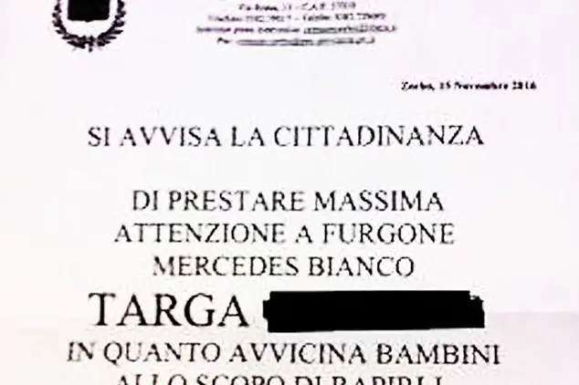 Invece i carabinieri hanno chiamato lui per dirgli che forse avrebbe dovuto contattarli prima di diffondere il panico tra le mamme e i papà di Zerbo con una notizia totalmente priva di qualsiasi riscontro. Il sindaco prima ha provato a difendersi dicendo di aver saputo del furgone da un collega di un paese vicino e poi ha fatto affiggere questo nuovo avviso, scritto in un magnifico burocratese: "In relazione al comunicato del 15/11/2016 relativo alla segnalazione di furgone Mercedes bianco con a bordo soggetti intenti ad attenzionare bambini, si comunica che a seguito di verifiche effettuate è da ritenenersi privo di ogni fondamento". Tutto falso, dunque a parte la targa del furgone del poveraccio che non c'entra niente.