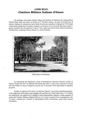 Scrivo per mettere in luce una realtà poco conosciuta se non dimenticata: ad Amburgo (Germania) c'è il "Cimitero Militare Italiano d'Onore" che custodisce le spoglie di 5.839 nostri soldati. C'è una croce e un altare, ma penso che mai nessuno vi abbia celebrato messa. Solo nel 1996 sono venuto a conoscenza, per puro caso, di questo cimitero e mi sono messo subito alla ricerca della tomba di mio padre, Trapè Alfredo, che è deceduto nel campo di concentramento tedesco di Bergen Belsen il 27 Gennaio 1945, ufficialmente per "paralisi cardiaca" ma in realtà di fame, come mi hanno testimoniato alcuni sopravvissuti. Subito sono partito, insieme a mia sorella, alla ricerca della tomba di nostro padre e l'abbiamo trovata dopo un lungo e avventuroso viaggio.