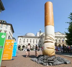 Una sigaretta gigante in piazza della Scala a Milano è l'iniziativa della Fondazione Umberto Veronesi, che oggi ha portato in piazza l'installazione di una grande sigaretta spenta come se fosse schiacciata in un posacenere, per dire stop al fumo. Accanto alla sigaretta dei pannelli informativi raccontano il viaggio, e i danni del fumo, dalla bocca, ai polmoni, fino alla pelle e al cervello.