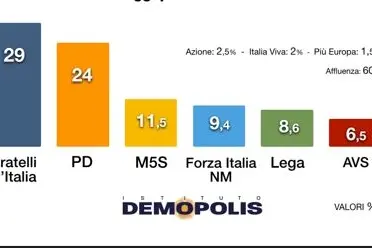 Il Movimento 5 Stelle, attualmente impegnato in un conflitto interno tra Giuseppe Conte e Beppe Grillo, si attesterebbe all’11,5%. Forza Italia, con il 9,4%, supererebbe la Lega, che invece si fermerebbe all’8,6%. L’alleanza Verdi Sinistra (AVS) registrerebbe il 6,5%, confermando la crescita già evidenziata durante le Elezioni Europee. I dati segnalano inoltre un ridimensionamento del Terzo Polo, con Azione al 2,5%, Italia Viva al 2% e Più Europa all’1,5%.