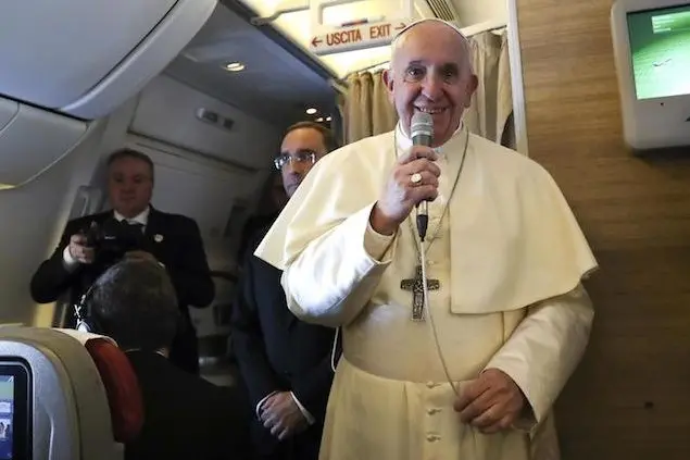 Pochi giorni dopo Panama papa Francesco riparte per un viaggio internazionale. "Sembra ieri, anzi era ieri, che ci siamo ritrovati qui", dice il direttore ad interim della Sala stampa vaticana, Alessandro Gisotti. "Tra i tanti manifesti a Panama, ricorda prima di dare la parola a Bergoglio, "ce n'era anche uno della comunità islamica che dava il benvenuto al Papa 'messaggero di pace '".