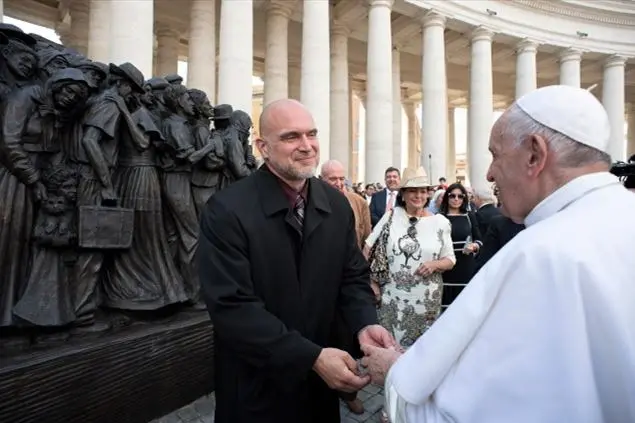 Sono circa 30 anni che Timothy Schmalz scolpisce soggetti religiosi «ossessivamente», per usare le sue parole. Eppure lo scultore canadese sostiene di cominciare solo ora a comprendere qualcosa sull’arte cristiana: «Il segreto sta nel capire le Scritture, al punto da farle diventare una parte di te. Negli ultimi cinque anni ho iniziato ad ascoltare cd sulla Bibbia mentre lavoro. Posso ascoltare lo stesso passaggio anche cento volte perché so che è magari alla centesima volta che finalmente ne comprendo il vero significato. È come una conversazione interiore che mi aiuta a creare qualcosa che ha significato», racconta l’autore del monumento ai migranti, Angels Unaware (“Angeli inconsapevoli”), inaugurato da papa Francesco a settembre in piazza San Pietro in occasione della 105ª Giornata mondiale del migrante e del rifugiato. Schmalz ha lavorato quasi ininterrottamente ogni giorno per un anno e mezzo a questa scultura in argilla e bronzo che rappresenta una barca con a bordo 140 migranti, diversi per nazionalità, religione e periodo storico a cui appartengono. Ogni personaggio è curato nei minimi particolari. Tra di loro spuntano le ali di un angelo, un riferimento alla Lettera agli Ebrei (13,2) in cui si legge: «Non dimenticate l’ospitalità; alcuni, praticandola, senza saperlo hanno accolto degli angeli».