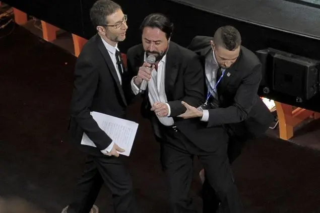 Ci siamo cascati tutti. Quando ieri sera un tizio barbuto ha iniziato a sbraitare dentro il Teatro Ariston "basta, vogliamo sentire solo le canzoni" e Fabio Fazio ha ripetuto la litania "tanto non ha il microfono, non si sente niente" in sala stampa, e crediamo anche tra gli spettatori a casa, si è levata un'unica voce: "Oh, no, ancora!".