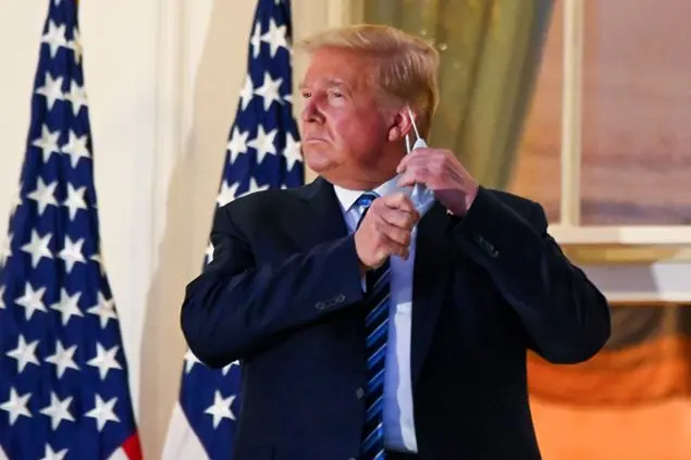 (Foto Reuters: Donald Trump si toglie la mascherina all'ingresso della casa Bianca, dopo l'uscita dall'ospedale)