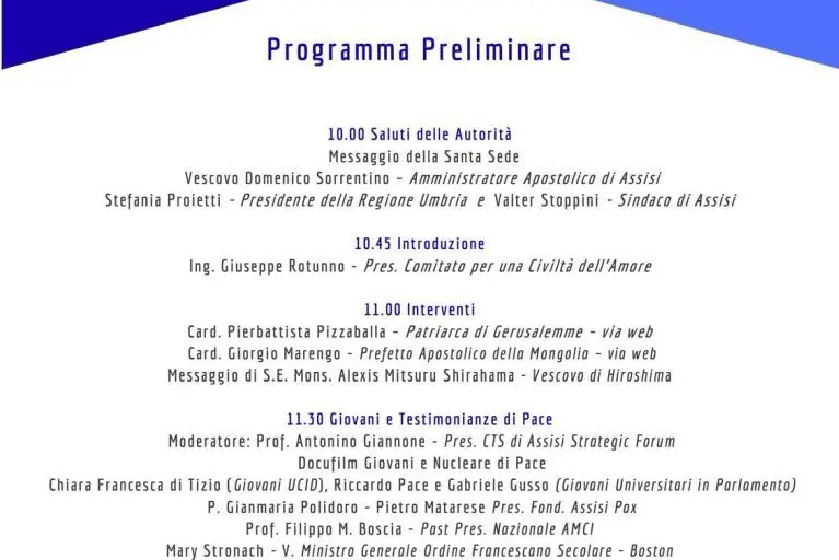 Martedì 24 febbraio ad Assisi, Città della Pace, nella Sala della Spogliazione di San Francesco, con inizio alle ore 10.00, si tiene il Seminario internazionale per la Pace nucleare, promosso da Civiltà dell’Amore e Assisi Strategic Forum, a cui parteciperanno Cardinali e Vescovi (Hiroshima e Assisi), esperti nucleari di USA, Russia e Italia, Testimoni di Pace.