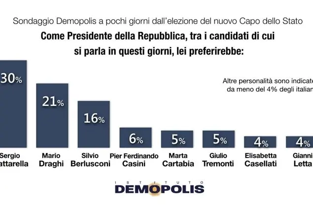 Se questi sono i desiderata, diversi invece sono i pronostici. Secondo l’indagine, commissionata all’Istituto dal programma otto e mezzo, il 34 per cento degli intervistati ha dichiarato che al Quirinale andrà Mario Draghi, il 20 immagina una riconferma di Mattarella, il 15 pensa che possa spuntarla Silvio Berlusconi. Ma quasi un quinto dei cittadini intervistati da Demopolis (il 19 per cento), è convinto che alla fine, come molte altre volte, sarà eletta una personalità di cui si parla meno alla vigilia.