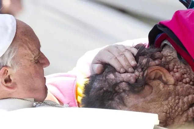 Francesco aveva accarezzato il capo e la nuca di Vinicio Riva, sfigurati dalle escrescenze, accendendo tra l'altro i riflettori sulla neurofibromatosi, malattia rara che solo in Italia colpisce migliaia di persone. La neurofibromatosi è una delle malattie genetiche più diffuse, ma è poco nota perché spesso le persone malate si nascondono. L’ostacolo più grande da superare resta lo stigma sociale che accompagna queste persone, che spesso hanno un aspetto fisico difficile da accettare e da gestire. In diverse interviste, Vinicio raccontava di aver baciato la mano di Francesco, «mi ha attirato a sé, - aggiungeva - abbracciandomi forte e baciandomi il viso. Avevo la testa contro il suo petto, le sue braccia che mi avvolgevano. E lui mi teneva stretto stretto, come coccolandomi, non si staccava più. Ho cercato di parlare, di dirgli qualcosa, non ci sono riuscito: l’emozione era troppo forte. È durato poco più di un minuto, ma a me è sembrata un’eternità. Dopo, mi sono girato verso la zia e le ho detto: Qua ghe aso le pene, Qui ci lascio le penne».