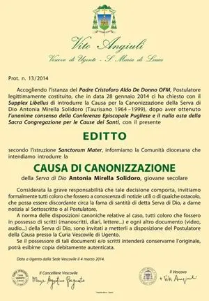 La sua grande testimonianza di fede, la sua generosità verso gli altri, l’amore per il prossimo nonostante il calvario ha lasciato un segno profondo in quanti l’hanno conosciuta. Il 15 dicembre 2007 la Conferenza episcopale pugliese ha dato parere favorevole per avviare la causa di canonizzazione e beatificazione, mentre il 3 marzo del 2008 è arrivato il nulla osta da parte della Congregazione per le Cause dei Santi. Il 12 marzo 2009 l’allora vescovo di Ugento-Santa Maria di Leuca, Vito De Grisantis nominò come postulatore diocesano per la causa in corso padre Cristoforo Aldo De Donno. Mirella Solidoro diventò Serva di Dio. “In questi anni, insieme a don Napoleone, ho raccolto tutti i documenti necessari per il processo di canonizzazione” - spiega padre Cristoforo del Convento San Francesco di Manduria.