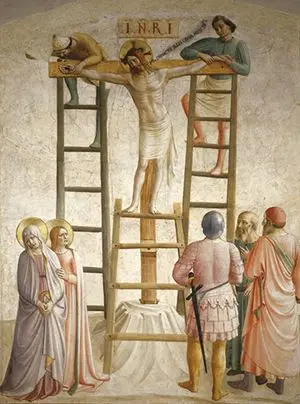 Nel 1436 i domenicani di Fiesole s’insediarono nel centro di Firenze, nel convento di San Marco, che era stato da poco restaurato da Michelozzo, e patrono del quale era Cosimo di Giovanni de’ Medici, ormai da due anni “criptosignore” della città, devoto dell’Ordine e, essendo d’origini mugellane, conterraneo di fra Giovanni. Fu appunto Cosimo ad affidare a Giovanni, nel 1440, il compito di abbellire il convento con una serie di affreschi: il frate artista si dette con entusiasmo, a quel punto, a un’intensa attività di pittore “a fresco” ch’era tuttavia nuova per lui, decorando la nuova bella sede – anche con l’aiuto di alcuni assistenti, per quanto non si può dire che avesse una vera e propria scuola – con molti dipinti per il chiostro, la casa del capitolo e alcune fra le celle dei corridoi superiori. Fra questi, la Crocifissione, il Cristo pellegrino, la Trasfigurazione e la mirabile Annunciazione affrescata all’entrata del dormitorio.