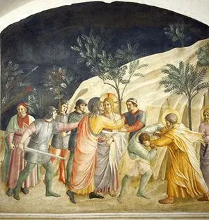 Guido di Pietro Trosini, detto Beato Angelico, nacque a Vicchio di Mugello, l’area collinare a nord-est di Firenze verso i passi appenninici che danno in Emilia, tra 1395 e 1400. Entrato giovane nell’Ordine dei Predicatori col nome di Giovanni da Fiesole nel 1418, e pronunziati sette anni dopo, nel 1425, i voti solenni, fu assegnato al convento di San Domenico sulle pendici tra Fiesole e Firenze. Per quanto avesse avviato la sua attività già prima di far ingresso nella vita religiosa, e fin dal 1417 fosse ricordato quale “dipintore”, cominciò la sua vera e propria attività in modo umile, come miniatore di codici liturgici (tra le sue realizzazioni in tale ambito è la Madonna dei Domenicani del Messale numero 558 del fiorentino museo di San Marco): e lo stile del miniaturista, caratterizzato dalla finezza del tratto, dalla limpida chiarezza della luce e dalla vivezza ariosa dei colori, restò sempre una caratteristica della sua opera, giungendo perfino a ingannare alcuni critici che, sopravvalutando i particolari, in lui videro un esponente dell’eleganza gotico-internazionale (il gotico detto “fiorito” o “fiammeggiante”) trascurando invece la sostanza del suo messaggio, profondamente legato alle novità prospettiche e volumetriche introdotte da Masaccio. L’influenza su di lui esercitata dal grande maestro innovatore si riscontra nel San Gerolamo conservato a Princeton, che risale al 1424.
