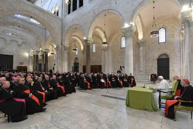 Dopo aver ascoltato le parole del cardinale Gualtiero Bassetti, che ha pensato all’incontro facendosi interrogare dall’ispirazione di Giorgio La Pira sul Mediterraneo, quelle del cardinale Vinko Puljić, arcivescovo di Sarajevo e presidente della Conferenza Episcopale della Bosnia-Erzegovina che ha ricordato i giorni terribili della guerra, e ricorda cosa gli disse un vescovo dell’Europa occidentale nei giorni terribili della guerra e di monsignor Pierbattista Pizzaballa, amministratore Apostolico «sede vacante» del Patriarcato Latino di Gerusalemme, presentano i risultati della due giorni che ha portato a Bari 58 vescovi di 60 Paesi del Mediterraneo, che ha sottolineato che «le Chiese del Medio Oriente e del Nord Africa hanno più volte ribadito che non hanno bisogno solo di aiuti economici, ma innanzitutto di solidarietà, di sentirsi ascoltate, che qualcuno faccia propria la loro difficile realtà, dove però vi è anche la luce di tante testimonianze di fedeltà e di solidarietà umana e cristiana», papa Francesco è partito dal ricordo dell’altro incontro che lo portò a Bari un anno e mezzo fa insieme con i patriarchi ortodossi. «Quella era la prima volta dopo il grande scisma, eravamo tutti e questa è una prima volta di tutti i vescovi che si affacciano sul Mediterraneo. Io credo che potremmo chiamare Bari capitale dell’unità, l’unità della Chiesa se monsignor Cacucci lo permette».