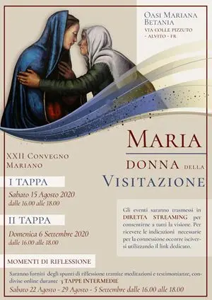 È un cammino di riflessione in più tappe per approfondire la conoscenza della Madre di Dio, consolata e consolatrice. L'Oasi mariana Betania, che ha sede ad Alvito, in provincia di Frosinone, organizza un convegno su Maria, donna della visitazione. Due gli appuntamenti principali, sabato 15 agosto, dalle 16 alle 18, e domenica 6 settembre, sempre dalle 16 alle 18, uniti da tre tappe intermedie, tutte di sabato, tutte dalle 16 alle 18: il 22 e il 29 agosto, nonché il 5 settembre. Gli eventi saranno trasmessi in dirertta streaming per consentirne a tutti la visione. Per ricevere le indicazioni necessarie a connettersi occorre iscriversi cliccando qui.