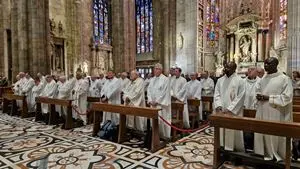 «Da ieri c'è un immenso impatto emotivo per la morte di Papa Francesco. Sono state fatte e verrannno fatte analisi e condivisioni d'esperienza. Oggi commemoriamo la figura del Papa e del suo Pontificato. Siamo qui per mettete in pratica la parola che il Papa ha detto più volte: “Pregate per me”. Preghiamo dunque per lui e chiediamo alle Scritture di insegnarci ad ascoltare e a celebrare anche ora quella Pasqua, che Francesco ha celebrato domenica e compiuto ieri», ha sottolineato monsignor Delpini all'inizio della Messa. Durante la celebrazione è stato utilizzato il calice che papa Francesco aveva donato all'ex arcivescovo di Milano, il cardinale Angelo Scola, il 25 marzo 2017.