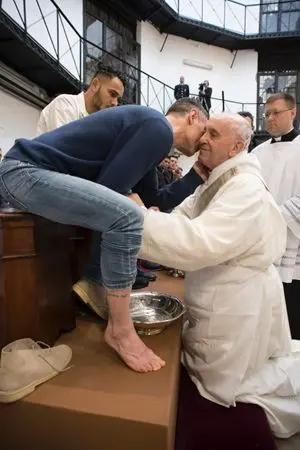 Bergoglio ricorda che «se tanti re, imperatori, capi di Stato avessero capito questo insegnamento di Gesù e invece di comandare, di essere crudeli, di uccidere la gente avessero fatto questo, quante guerre non sarebbero state fatte! Il servizio: davvero c’è gente che non facilita questo atteggiamento, gente superba, gente odiosa, gente che forse ci augura del male; ma noi siamo chiamati a servirli di più. E anche c’è gente che soffre, che è scartata dalla società, almeno per un periodo, Gesù va lì a dir loro: “Tu sei importante per me”». Una importanza che è sottolineata proprio dal gesto di lavare i piedi: «Gesù viene a servirci, e il segnale che Gesù ci serve oggi qui, al carcere di Regina Coeli, è che ha voluto scegliere 12 di voi, come i 12 apostoli, per lavare i piedi. Gesù rischia su ognuno di noi. Sappiate questo: Gesù si chiama Gesù, non si chiama Ponzio Pilato. Gesù non sa lavarsi le mani: soltanto sa rischiare! Guardate questa immagine tanto bella: Gesù chinato tra le spine, rischiando di ferirsi per prendere la pecorella smarrita», dice mostrando il regalo che ha portato: l’altare sul quale ha celebrato messa che resterà nel centro penitenziario. «Oggi io, che sono peccatore come voi, ma rappresentò Gesù», dice il Papa, «sono ambasciatore di Gesù. Oggi, quando io mi inchino davanti a ognuno di voi, pensate: “Gesù ha rischiato in quest’uomo, un peccatore, per venire da me e dirmi che mi ama”. Questo è il servizio, questo è Gesù: non ci abbandona mai; non si stanca mai di perdonarci. Ci ama tanto. Guardate come rischia, Gesù!».