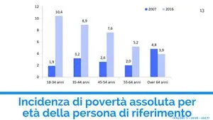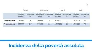Un altro capitolo doloroso riguarda la povertà, che dal 2007 al 2017 ha avuto nelle regioni del Nord un'impennata del 166%, non diversamente da quanto è accaduto nel resto della Penisola. Basandosi su dati Istat riferiti all'intero settentrione, Zangola stima che attualmente, in Piemonte, circa 100.000 famiglie vivano in condizione di povertà assoluta (cioè tale da non consentire un tenore di vita minimamente accettabile). L'economista precisa che «si tratta con ogni probabilità di una stima per difetto, se si considera che molte regioni, a differenza del Piemonte, hanno recuperato livelli di reddito e di occupazione molto vicini se non superiori a quelli pre-crisi». E se negli anni antecedenti alla recessione la categoria più svantaggiata era quella degli anziani, «da circa un lustro si sta assistendo ad un completo ribaltamento della situazione». Quindi, ancora una volta, emerge che «sono i giovani e i giovanissimi a vivere la situazione più critica». In Piemonte, circa 67.000 persone tra i 18 e i 34 anni si trovano in condizioni di grave indigenza.