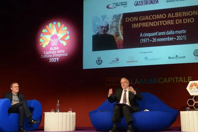 Il tema del primo incontro ha approfondito il ruolo che la figura di Alberione ebbe nel contesto ecclesiale del Novecento. Dopo l’introduzione del direttore di Gazzetta d’Alba don Giusto Truglia, che ha proposto la candidatura del fondatore dalla Famiglia paolina a «patrono degli imprenditori», ha preso la parola Andrea Riccardi, studioso di storia della Chiesa, fondatore della Comunità di Sant’Egidio e ministro della Cooperazione con Mario Monti. «Alberione, nato nel 1884, è un uomo del Novecento, che vive le vicende dell’Italia saldamente unificata e muore nel 1971, in piena Guerra fredda» ha esordito. «Mai fu un prete avulso dalla storia del secolo passato: fu una persona calata nella realtà, che non si chiuse nelle istituzioni ecclesiastiche, nel piccolo mondo antico della Chiesa e della Langa, ma seppe sentire le spinte della storia».