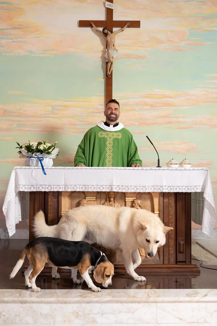 C’è poi il suo rapporto con gli animali, un tratto che lo ha reso molto amato anche sui social. In parrocchia, infatti, vivono con lui due cani che ha salvato dall’abbandono: Tempesta, un beagle instancabile, e Baloo, un pastore bianco dal temperamento mite. «Ogni giorno mi insegnano l’amore gratuito, quello senza tornaconto. Accolgono chiunque per quello che è. Gli animali non vanno umanizzati, ma il loro affetto sa davvero prendersi cura della vita».
