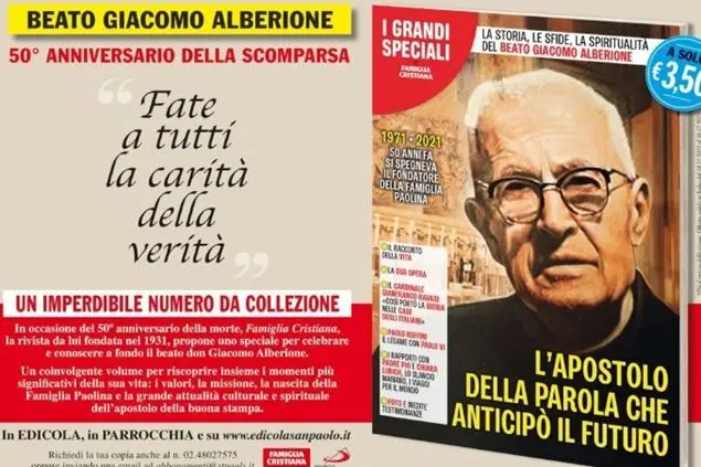 Annunciò con parole nuove verità antiche. Volle che il Vangelo vestisse i panni della cronaca nutrendo menti e cuori grazie a libri, giornali, cinema e radio. Don Giacomo Alberione morì il 26 novembre 1971. A cinquant’anni di distanza, Famiglia Cristiana, fiore all’occhiello della Famiglia Paolina da lui fondata, pubblica uno speciale, da oggi in edicola e in parrocchia, che tratteggia dal punto di vista umano, culturale, spirituale e imprenditoriale la figura di questo sacerdote nato il 4 aprile 1884 a San Lorenzo di Fossano, in provincia di Cuneo.