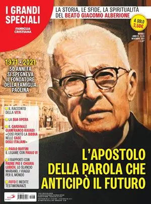 Nello speciale sono inoltre presentati i dieci rami, maschili e femminili, della Famiglia Paolina e vengono pubblicate molte foto inedite. Don Domenico Soliman, il postulatore della causa di canonizzazione, spiega le tappe verso gli altari di Giacomo Alberione (già proclamato beato il 27 aprile 2003), e il superiore generale della Società San Paolo, don Valdir José De Castro, traccia la rotta per il futuro: «Siamo chiamati a una fedeltà creativa, continuando a scrutare i segni dei tempi per annunciare il Vangelo con i linguaggi moderni. Per arrivare ovunque».