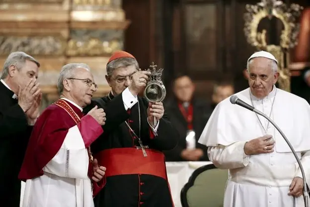 Improvvisa tutto il pomeriggio, papa Francesco. Dà i discorsi per letti, ma poi parla a braccio ai detenuti, circa 100, con i quali ha pranzato nel carcere di Poggioreale: «Dio è presente anche in questi luoghi», dice ai 12 seduti con lui e con il procuratore delle carceri. Poi li saluta uno a uno prima di arrivare in cattedrale per l'incontro con le religiose, i religiosi e i sacerdoti. Al termine dell'incontro il cardinale Sepe annuncia che «il sangue di San Gennaro si è già sciolto per metà» e il Papa ribatte: «Il vescovo dice che il sangue è per metà sciolto, segno che il santo ci vuole bene per metà, dobbiamo convertirci un po' tutti perché ci voglia più bene».