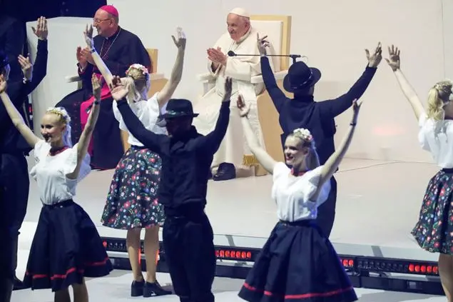 Il regalo insolito è il cubo magico inventato dall’ungherese Rubik nel 1974. Il responsabile per la pastorale giovanile, monsignor Ferenc Palanki, consegna al Papa anche una bottiglia di vino. Il Papa ringrazia e sorride. È ansioso di ascoltare, dopo averli visti ballare e sentiti cantare, i giovani. Dal quindicenne Bertalan Krabót, studente del Liceo degli Scolopi Dugonics Árpád di Szeged (diocesi di Szeged-Csanád), ai diciassettenni Dóra Csóka e Tódor Levcsenkó, la prima studentessa del Liceo dei Cistercensi Nagy Lajos di Pécs (Diocesi di Pécs) e il secondo studente del Liceo dei Gesuiti Fényi Gyula di Miskolc (Ungheria), ma proveniente dall’Eparchia di Munkachevo (Ucraina)alla ventenne Krisztina Nagy, che frequenta l'Università Cattolica Eszterházy Károly, nell’arcidiocesi di Eger. Raccontano come hanno scoperto la fede, come l’hanno coltivata anche nei giorni di guerra e di crisi profonda. Il Papa dichiara subito di essere «felice di stare con voi». Li sprona a non accontentarsi di risposte preconfezionate per i loro dubbi, ma di cercare risposte grandi. Ricorda che il Signore è pronto a risollevarci dalle nostre cadute, a perdonarci. Lo fa ripetere a tutti i giovani chiamando in causa il traduttore. «Mettete questo nella testa: Dio non vuole condannare, ma perdonare. Mettete questo nella testa: Dio perdona sempre. Dio perdona sempre. Come si dice in ungherese, come si dice tu che sei il traduttore». E poi chiede anche un po’ di silenzio perché ciascuno possa rispondere nel suo cuore alla domanda «Cosa cercate? Che cosa cercate nella vita, che cosa cercate nel vostro cuore? In silenzio ognuno risponde dentro di sé. Che cosa cerco io?». Ricorda che «Gesù non fa tanta predica, no, fa strada, fa strada insieme a ciascuno di noi, non vuole che i suoi discepoli siano scolari che ripetono una lezione, ma giovani liberi e in cammino, compagni di strada di un Dio che ascolta, che ascolta i loro bisogni ed è attento ai loro sogni». Resta vicino a loro anche quando scivolano quando fanno richieste sbagliate come i due che vorrebbero stare uno alla sua destra e uno alla sua sinistra quando Lui diventerà Re. «Ma è interessante», spiega il Papa, «vedere che Gesù non li rimprovera per aver osato, non dice loro: “Come vi permettete, smettete di sognare queste cose!”. No, Gesù non abbatte i loro sogni, ma li corregge sul modo di realizzarli; accetta il loro desiderio di arrivare in alto, è buono quello, ma insiste su una cosa, da ricordare bene: non si diventa grandi scavalcando gli altri, ma abbassandosi verso gli altri; non a discapito degli altri, ma servendo gli altri».