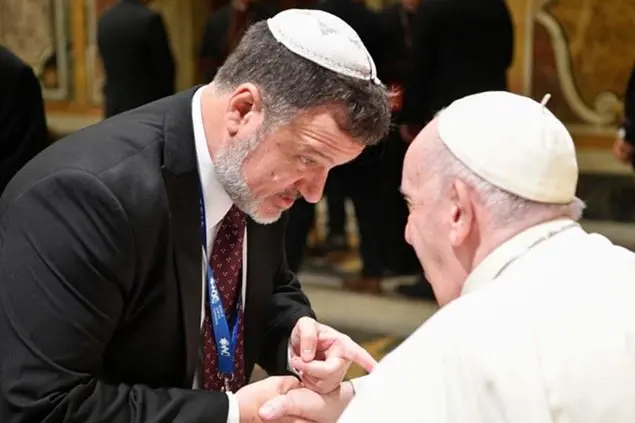 «Oggi, in tante regioni del mondo, la pace è minacciata», ha infine affermato Bergoglio, lanciando un forte appello: «Riconosciamo insieme che la guerra, ogni guerra, è sempre, comunque e dovunque una sconfitta per tutta l’umanità!. Penso a quella in Ucraina, una guerra sacrilega che minaccia ebrei e cristiani allo stesso modo, privandoli dei loro affetti, delle loro case, dei loro beni, della loro stessa vita!. Solo nella volontà seria di avvicinarsi gli uni agli altri e nel dialogo fraterno è possibile preparare il terreno della pace”. “Come ebrei e cristiani, cerchiamo di fare tutto ciò che è umanamente possibile per arrestare la guerra e aprire vie di pace»