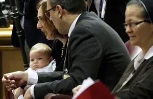 L’ultimo è il più giovane “padre sinodale” del Sinodo sulla famiglia. Si chiama Davide, 4 mesi e segue attentamente gli interventi in aula e nei gruppi di lavoro linguistici, mai uno strillo, mai neppure una smorfia. Alternativamente passa dalla carrozzella, dove qualche volta fa un pisolo, alle braccia della mamma Patrizia e del papà Massimo, i due veri “uditori”, una delle 18 coppie di sposi che partecipano al Sinodo sulla famiglia. I coniugi Patrizia e Massimo Paloni di figli ne hanno altri 11, in tutto sei maschi e sei femmine, che li aspettano a Maastricht in Olanda, dove fanno i missionari.