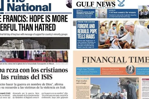 Una grande foto del papa fra le rovine di Mosul riempie anche buona parte della prima pagina del quotidiano emiratino The National. Il titolo riporta le parole del pontefice “La speranza è più forte dell’odio”. Un altro quotidiano degli Emirati Arabi Uniti, Gulf News, mette in prima pagina una foto del papa che carezza sulla fronte un bambino. Il titolo: “Perdonate e ricostruite, dice il papa agli iracheni”. Il papa a Mosul è in prima pagina anche sul quotidiano spagnolo El Paìs. La foto è accompagnata dal titolo “Il Papa prega con i cristiani fra le rovine dell’ISIS”.