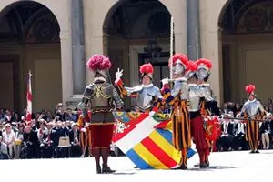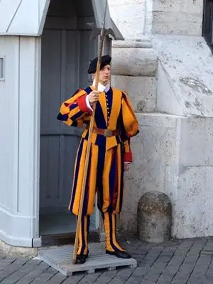 L'uniforme ufficiale delle guardie svizzere è di colore blu, rosso e giallo scuro, con dei distinti tratti rinascimentali.