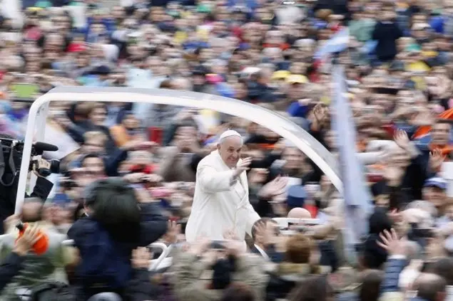 Non legge ampi brani del testo preparato per aggiungere a braccio le considerazioni più "calorose". Papa Francesco conclude le catechesi sui sacramenti parlando del matrimonio. Come lui stesso ha preannunciato, nelle prossime udienze generali il Papa si soffermerà sui doni dello Spirito Santo. Intanto, ai fedeli riuniti in piazza San Pietro, il Papa ha ricordato che «l’immagine di Dio è la coppia matrimoniale, è l’uomo e la donna, tutti e due, non soltanto il maschio, l’uomo, non soltanto la donna, no: tutti e due. E questa è l’immagine di Dio, e l’amore, l’alleanza di Dio con noi è lì, è rappresentata in quell’alleanza fra l’uomo e la donna. E questo è molto bello, è molto bello! Siamo creati per amare, come riflesso di Dio e del suo amore. E nell’unione coniugale l’uomo e la donna realizzano questa vocazione nel segno della reciprocità e della comunione di vita piena e definitiva. Quando un uomo, una donna celebrano il sacramento del matrimonio Dio, per così dire, si rispecchia in essi: imprime in loro i propri lineamenti e il carattere indelebile del suo amore».