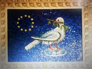 Il viaggio di papa Francesco in Europa comincia sotto il segno della pace. Il mosaico che il Papa ha voluto regalare al parlamento europeo, infatti, frutto del lavoro degli artisti dello Studio del Mosaico Vaticano, mostra la colomba della pace che ha sullo sfondo il cielo azzurro dell'Europa con le dodici stelle che, come i 12 segni dello zodiaco, rappresentano tutti i popoli europei compresi quelli che ancora non fanno parte dell'Unione.