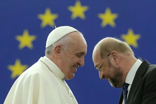 Dopo aver ascoltato l'Inno alla gioia, davanti alla folla e dopo il saluto ufficiale al presidente Martin Schulz, il Papa si è diretto al Parlamento per il primo dei due discorsi previsti. All'interno del Parlamento ha prima salutato a lungo la sua vecchia amica Elma Schmidt, una signora di 97 anni di Francoforte che lo aveva ospitato nel 1986, ai tempi del suo periodo di studio in Germania, e poi ha cominciato il suo discorso. Parole che sono state un richiamo forte alla speranza e al ritorno alla vocazione europea alla difesa dell'umanità. «Cari Eurodeputati», ha detto Francesco al termine di un lunghissimo discorso, «è giunta l’ora di costruire insieme l’Europa che ruota non intorno all’economia, ma intorno alla sacralità della persona umana, dei valori inalienabili; l’Europa che abbraccia con coraggio il suo passato e guarda con fiducia il suo futuro per vivere pienamente e con speranza il suo presente. È giunto il momento di abbandonare l’idea di un’Europa impaurita e piegata su sé stessa per suscitare e promuovere l’Europa protagonista, portatrice di scienza, di arte, di musica, di valori umani e anche di fede. L’Europa che contempla il cielo e persegue degli ideali; l’Europa che guarda, difende e tutela l’uomo; l’Europa che cammina sulla terra sicura e salda, prezioso punto di riferimento per tutta l'umanità!».