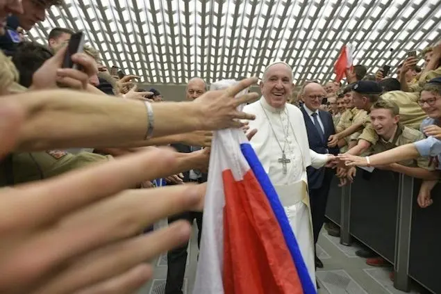 "Avete fatto tanta strada", ha esordito il Papa, accogliendo gli Scout del'Unione internazione guide scout d'Europa, partecipanti all'Euromoot, "Siete un po’ stanchi, sicuramente. Di una cosa sono sicuro: che dentro vi sentite più liberi di prima". E ha proseguito: "La libertà si conquista in cammino, non si compra al supermercato, non arriva stando chiusi in stanza col telefonino e nemmeno sballandosi un po’ per evadere dalla realtà. No, la libertà arriva in cammino, passo dopo passo, insieme agli altri, mai soli. Nel vostro cammino avete avuto cinque tappe, cinque incontri con grandi santi che in epoche diverse hanno percorso l’Europa: Paolo di Tarso, Benedetto da Norcia, Cirillo e Metodio, Francesco di Assisi, Caterina da Siena. Questa gente, questi santi, che cosa hanno avuto in comune? Non hanno atteso qualcosa dalla vita o dagli altri, ma si sono fidati di Dio e hanno rischiato, si sono messi in gioco, in cammino per realizzare dei sogni così grandi che dopo secoli hanno fatto bene anche a noi, a voi, a tutti. Hanno dato la vita, non l’hanno tenuta per sé".