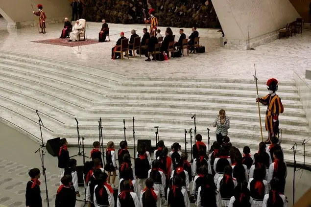 A seguire i bambini hanno incontrato Papa Francesco, “consegnando” con le loro voci uno speciale dono: la canzone inedita “Fratelli Tutti, se vuoi” scritta dal Cardinale Lorenzo Baldisseri e con la collaborazione di don Francesco Marruncheddu e del Maestro Marcello Filotei ispirata all’enciclica di Sua Santità, “Fratelli tutti”.