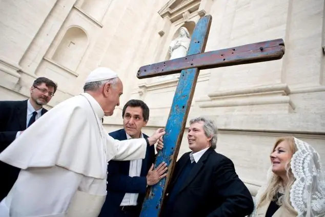 Visibilmente commosso, il Pontefice ha baciato e benedetto la croce costruita con due assi di legno di 2,80 metri d’altezza per 1,50, pesante 60 chili. Emanuele Vai, presidente della fondazione Casa dello spirito e delle arti, che ha promosso l’iniziativa ha detto che la croce dei migranti di Lampedusa «girerà per tutta l’Italia, accolta da chi ne farà richiesta, in una grande staffetta spirituale». Punto d’arrivo sarà la chiesa di Santo Stefano a Milano, «riferimento delle persone straniere che vivono nella città». Arnoldo Mosca Mondadori, fondatore della Casa dello spirito e delle arti, ha voluto sottolineare «l’importanza di passare di mano in mano la croce come segno di fraternità. Potremo, insieme, riscoprire la croce come simbolo del dolore umano e ritrovarne la bellezza e il valore che, con la risurrezione, comunica vita e non morte».