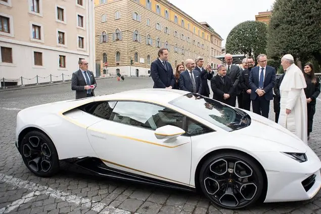 La Lamborghini ha regalato un numero unico del modello Huracan. Il prezzo di listino è di 206.790 euro, ma il valore è destinato a salite visto il contesto e l'unicità dell'auto. Jorge Mario Bergoglio ha stabilito di destinare quanto verrà ricavato dall'asta lo per la ricostruzione della Piana di Ninive in Iraq (per mezzo della Fondazione di diritto pontificio "Aiuto alla Chiesa che Soffre") e garantire così il ritorno dei cristiani alle loro radici, dopo un triennio vissuto da sfollati interni nel Kurdistan iracheno; per la Comunità Papa Giovanni XXIII (donne vittime della tratta e della prostituzione) nel decennale della morte di Don Oreste Benzi e nel cinquantesimo anniversario (2018) della fondazione della Comunità stessa; per due associazioni italiane che svolgono attività soprattutto in Africa, la Gicam del professor Marco Lanzetta (chirurgia della mano) e Amici del Centrafrica, che da anni operano con progetti dedicati soprattutto a donne e bambini.