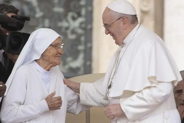 Conclusione inconsueta oggi dell’udienza generale di papa Francesco che ha chiamato sul sagrato di San Pietro suor Maria Concetta Esu per abbracciarla e consegnarle un’onorificenza pontificia. La missionaria sarda, 85 anni, in qualità di ostetrica ha aiutato a nascere tremila bambini in Africa dove ha trascorso sessant’anni di vita. E il Pontefice ha voluto omaggiarla davanti ai fedeli: «Cari fratelli e sorelle, oggi abbiamo la gioia di avere con noi una persona che desidero presentarvi», ha detto Bergoglio, «è Suor Maria Concetta Esu, della Congregazione delle Figlie di San Giuseppe di Genoni. Perché faccio questo? Suor Maria Concetta ha 85 anni, e da quasi 60 è missionaria in Africa, dove svolge il suo servizio di ostetrica. Io», ha raccontato il Papa tra gli applausi dei fedeli e mentre la religiosa a tratti gli reggeva i fogli del testo per non farli volare, «l’ho conosciuta a Bangui, quando sono andato ad aprire il Giubileo della Misericordia. Là lei mi ha raccontato che nella sua vita ha aiutato a nascere circa tremila bambini. Che meraviglia! Anche quel giorno era venuta dal Congo in canoa, a 85 anni, a fare le spese a Bangui. In questi giorni è venuta a Roma per un incontro con le sue sorelle, e oggi è venuta all’udienza con la sua Superiora. Allora ho pensato di approfittare di questa occasione per darle un segno di riconoscenza e dirle un grande grazie per la sua testimonianza!».
