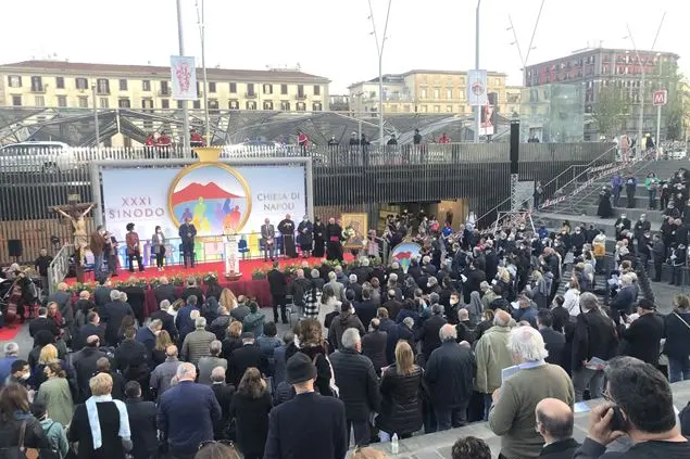Così dopo aver affidato il cammino sinodale alla Madonna bruna, Vergine del Carmelo, il luogo dove Napoli diventa ‘Mille culure’ non può che essere piazza Garibaldi, la porta d’ingresso della città che ogni giorno permette a lavoratori, forestieri, immigrati e turisti di essere accolti dalla città e ogni notte permette agli ultimi di dormire e improvvisando ricoveri di fortuna. È nella piazza ritrovata che l’arcivescovo di Napoli ha voluto celebrare l’apertura del Sinodo napoletano. Il primo appuntamento a cui hanno partecipato circa mille fedeli è stato ospitato nell’anfiteatro della piazza confinante con la stazione ferroviaria, una struttura che con una sua circolarità richiama al legame nei confronti del prossimo. Quel prossimo che attende al di là della strada, quando calato il caldo sole pomeridiano, per sopravvivere alle temperature notturne, deve avvolgersi in un piumone arancione. Nel buio quel volto non si distingue. Si capisce solo che quel fratello fa parte della schiera degli ultimi.