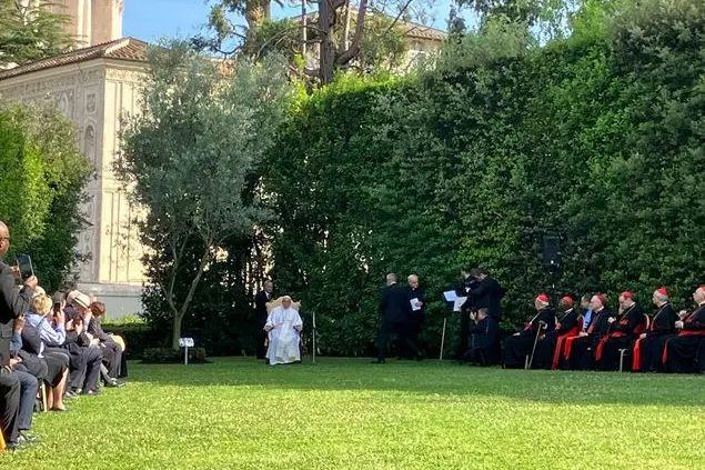 Sembrano essersi chiusi irrimediabilmente gli spiragli per una soluzione del conflitto israelo-palestinese che si intravedevano dieci anni fa. Eppure il Pontefice, nell’anniversario dell’Invocazione per la Pace in Terra Santa, non smette, ostinatamente, di invocare la fine della guerra. Insieme con gli ambasciatori di Israele e Palestina, dell’Ucraina e della Russia, di una ventina di cardinali, ha voluto ricordare «l’allora Presidente dello Stato d’Israele, il compianto Shimon Peres, e il Presidente dello Stato di Palestina, Mahmoud Abbas» che «accettarono il mio invito a venire qui per implorare da Dio il dono della pace. Poche settimane prima ero stato pellegrino in Terra Santa e proprio lì avevo espresso il grande desiderio che i due si incontrassero, per compiere un gesto significativo e storico di dialogo e di pace. Porto nel cuore tanta gratitudine al Signore per quel giorno, mentre conservo il ricordo di quell’emozionante abbraccio che i due Presidenti si scambiarono, anche alla presenza di Sua Santità Bartolomeo I, Patriarca Ecumenico, e dei rappresentanti delle comunità cristiane, ebraiche e musulmane provenienti da Gerusalemme», dice il Pontefice ricevendo le delegazioni nei giardini vaticani. Lì dove era stato piantato un albero di ulivo oggi si fa memoria di quell’evento. E lo si fa mentre «da mesi ormai assistiamo a una crescente scia di ostilità e vediamo morire sotto i nostri occhi tanti innocenti. Tutta questa sofferenza, la brutalità della guerra, le violenze che essa scatena e l’odio che semina anche nelle generazioni future dovrebbero convincerci che “ogni guerra lascia il mondo peggiore di come lo ha trovato. La guerra è un fallimento della politica e dell’umanità, una resa vergognosa, una sconfitta di fronte alle forze del male”». Per questo, continua il Pontefice, «invece che illuderci che la guerra possa risolvere i problemi e portare alla pace, dobbiamo essere critici e vigilanti verso un’ideologia oggi purtroppo dominante, secondo cui “il conflitto, la violenza e le fratture fanno parte del funzionamento normale di una società”».