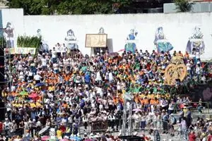 Le sedie di cartone, l’altare di paglia e bambù a forma di capanna. Un bassorilievo in bronzo, opera di un immigrato senegalese, adorna il palco dove il Papa celebra Messa. Al centro di Campobasso, nell’ex stadio Romagnoli, oltre 30 mila persone attendono il Papa. Nelle vie e negli spazi adiacenti, ce ne sono almeno altre 50 mila.