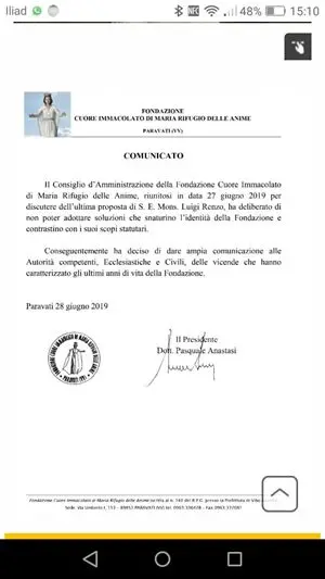 Nella lettera di risposta a monsignor Renzo si spiega, in particolare, che il direttivo «ha deliberato di non poter adottare soluzioni che snaturino l’identità della Fondazione e contrastino con i suoi scopi umanitari», e che, di conseguenza, lo stesso organo «ha deciso di dare ampia comunicazione alle autorità competenti, ecclesiastiche e civili, delle vicende che hanno caratterizzato gli ultimi anni della vita della Fondazione». «Abbiamo fatto il resoconto - specifica il presidente Anastasi - e già sono stati spediti i documenti e la relazione di tutto quello che è stato fatto in questi ultimi anni. Insomma, della vita recente della Fondazione, di tutte le attività e le cose che sono state realizzate, del Centro congressi e quant’altro. Il tutto è stato inviato alle autorità ecclesiastiche, a Roma, e a quelle civili, al ministero dell’Interno