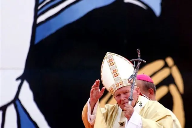 (In alto: Giovanni Paolo II allo stadio Jawaharlal Nehru di Nuova Delhi. Alle spalle del Papa, un'immagine di madre Teresa. Reuters)