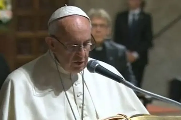 Pregano per la pace nella Basilica inferiore di San Francesco i cristiani di tutte le denominazioni, accanto alla tomba di San Francesco, “amico dei poveri”, dice il Papa all’inizio dell’invocazione “per dissipare le tenebre del male del terrorismo e della violenza”. Le altre religioni pregano nello stesso momento in altri luoghi di Assisi. E’ una preghiera corale che sale al cielo dalla città della pace a trent’anni dalla intuizione profetica di Karol Wojtyla. E’ lo Spirito di Assisi che ancora si mette in moto e non sarà l’ultima volta. Bergoglio è seduto tra il Patriarca ecumenico di Costantinopoli Bartolomeo e il primate anglicano Welby. Parla per primo l’anglicano e denuncia le economie fondate sulla sabbia, che fanno correre gli uomini “dietro ad illusioni”, che alimentano paure anche dello “straniero”, che portano al “risentimento e alla rabbia”. Poi tocca a Bartolomeo proporre una meditazione nella quale spiega che oggi ai cristiani tocca una “testimonianza di comunione” cioè di amore e di pace, anche fino al martirio, come nei primi secoli della Chiesa e come ancora oggi accade “in troppe aree del mondo e soprattutto in Medio Oriente”. Papa Francesco riflette sulle parole di Gesù sulla croce: “Ho sete”. E spiega che oggi in queste parole “possiamo sentire la voce dei sofferenti, il grido nascosto dei piccoli innocenti, cui è preclusa la luce di questo mondo, l’accorata supplica dei poveri e dei più bisognosi di pace”. Poi per essere più chiaro elenca coloro che implorano la pace: “Le vittime delle guerre, che inquinano i popoli di odio e la terra di armi”; “i nostri fratelli e sorelle che vivono sotto la minaccia dei bombardamenti o sono costretti a lasciare casa e migrare verso l’ignoto, spogliati di ogni cosa”. Tutti sono, aggiunge il Papa, “fratelli e sorelle del Crocefisso, piccoli del suo Regno”. Loro “hanno sete”, ma spesso, come a Gesù, viene offerto “l’aceto amaro del rifiuto”. Nessuno li ascolta, nessuno si preoccupa di rispondere a loro: “Essi incontrano troppe volte il silenzio assordante dell’indifferenza, l’egoismo di chi è infastidito, la freddezza di chi spegne il loro grido di aiuto con la facilità con cui si cambia un canale in televisione”. Invece è sulla croce, che il Papa chiama “albero della vita” che “il male è stato trasformato in bene” e i cristiani sono chiamati oggi ad essere loro stessi “alberi della vita”, cioè persone che “assorbono l’inquinamento dell’indifferenza e restituiscono al mondo l’ossigeno dell’amore”. Poi si prega per tutti i luoghi dove c’è guerra, violenza, tensioni. Dall’Afghanistan al Messico, dove ieri sono stati uccisi altri due sacerdoti vittime della violenza del narcotraffico, dal Gabon al Burundi a tanti Paesi africani, fino alla riconciliazione tra le due Coree. Naturalmente c’è la preghiera per la Siria e l’Iraq, per lo Yemen per la Terra Santa. E per l’Ucraina. E’ un lungo drammatico elenco. Si ricordano le vittime innocenti, gli anziani e i bambini, i prigionieri, tra cui i vescovi rapiti in Siria e per padre Paolo dall’Oglio, il gesuita scomparso in Siria tre anni fa e di cui non si hanno più notizie.