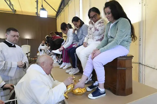 Per la prima volta la lavanda dei piedi a sole donne. La prima volta di un Papa alla casa circondariale di Rebibbia femminile. Papa Francesco, nell'istituto romano di reclusione, pur sulla sedia a rotelle, vuole lavare e baciare i piedi di 12 detenute. Con amore, come «Gesù ci ha insegnato». A braccio aveva pronunciato l’omelia per ricordare che «Gesù, con il gesto della lavanda dei piedi si umilia e con questo gesto ci dice quello che lui aveva detto: “Io non sono venutoper essere servito, ma per servire”. Ci insegna il cammino del servizio». E poi sottolinea l’altro episodio, «triste», quello del tradimento di Giuda «che non è capace di portare avanti l'amore», e poi «i soldi, l’egoismo, lo portano a questa cosa brutta», anche se «Gesù perdona tutto, perdona sempre. Solo chiede che noi chiediamo il perdono». E per questo, dice nel penitenziario romano, «Gesù perdona sempre solo noi ci stanchiamo di chiedere perdono Per questo oggi chiediamo al Signore la grazia di non stancarci. Sempre tutti noi abbiamo piccoli fallimenti, grandi fallimenti, ognuno ha la propria storia, ma il Signore ci aspetta sempre con le braccia aperte e non si stanca mai di perdonare». Prima di lavare i piedi alle ragazze ricorda che è «lo stesso che ha fatto Gesù. Lavare i piedi è un gesto che ci attira l'attenzione sulla vocazione del servizio e chiediamo al Signore che ci faccia crescere tutti noi nella vocazione del servizio». Piangono le detenute mentre il Papa versa l’acqua, asciuga, bacia, sorride a ciascuna di loro. Ad assistere alla messa, celebrata da don Andrea Carosella, circa 200 persone tra detenute, operatori penitenziari, agenti di custodia, volontari. Al termine un grande ringraziamento a nome delle "360 detenute e un bambino" che si sono sentite incoraggiate dall'affetto del Papa e della Chiesa.