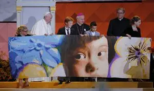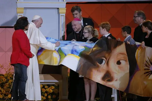 C'è stato un momento "colorato" oltre che commovente, ieri sera, alla festa e alla veglia di preghiera dell'ottavo Incontro mondiale delle famiglie. Dopo l’intervento di papa Francesco, monsignor Charles Joseph Chaput, arcivescovo della città (che va famosa, tra l'altro, anche per i suoi tanti murales) ha parlato di «momento speciale nel tempo che mai sarà dimenticato». Sul palco sono stati quindi portati tre pannelli di un gigantesco murale, al quale bambini, uomini, donne e anziani hanno lavorato tutta l’estate e che sarà montato sulla facciata della scuola “San Malachia”. Bergoglio ha completato l’opera dando l’ultima pennellata e apponendo la sua firma. Poi l’emozionante esecuzione del Padre Nostro di Andrea Bocelli.