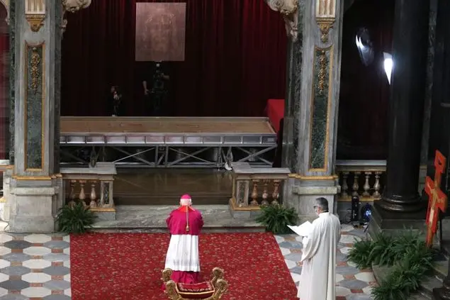 Non un dipinto, non una stampa, né un artefatto, ma un lenzuolo che porta i segni di un uomo veramente torturato e crocifisso. Anche al di là del dibattito scientifico che da decenni stimola studiosi di tutto il mondo (un dibattito sempre aperto), la Sindone è una narrazione per immagini, sorprendentemente conforme ai racconti evangelici della Passione. Oggi, per circa un’ora, il sudario è tornato a mostrarsi agli occhi del mondo, seppur per il tramite delle telecamere. A differenza delle ostensioni “tradizionali”, non è stato spostato dalla cappella nel transetto del Duomo che abitualmente lo custodisce. Anche la teca che lo protegge è rimasta in posizione orizzontale. E il sistema di illuminazione è stato studiato fin nei minimi dettagli, per permettere una buona visibilità, limitando però il più possibile l’esposizione ad agenti esterni (come intense fonti di luce), che a lungo andare potrebbero deteriorare la tenuissima immagine impressa sulle fibre del lino. Poche le persone ammesse in Cattedrale. Tra loro, esponenti di ordini religiosi e delle istituzioni, in rappresentanza dei tantissimi fedeli e cittadini che, a causa delle misure anti-Covid, hanno dovuto seguire la celebrazione da casa.
