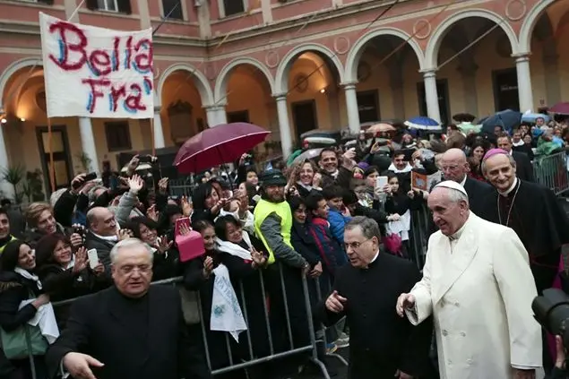 Gli striscioni sono scritti a mano: "Benvenuto Francesco". Il Papa ascolta in piedi il saluto del parroco e poi dei bambini, bianchi e di colore, che si alternano al microfono. Piove a dirotto a Roma, ma il Papa non prende l’ombrello. Abbraccia quanti sono venuti a incontrarlo in via Marsala, a due passi dalla stazione Termini, nella parrocchia del Sacro Cuore di Gesù a Castro Pretorio. Appena duemila abitanti, ma una grande struttura gestita dai salesiani, che anima il territorio e dà ascolto e accoglienza alle tante povertà che si raccolgono attorno alla stazione. Il parroco, don Valerio Baresi, ha visto il quartiere via via trasformarsi. Dai quindicimila di un tempo agli abitanti di oggi, con le case sostituite da alberghi a ore, bed and breakfast, bar. Nel cortile dell’oratorio, voluto da don Bosco e che il santo ha visitato venendo a Roma, i fedeli sono stipati per vedere Francesco.